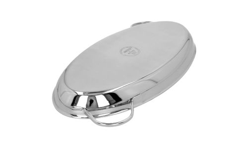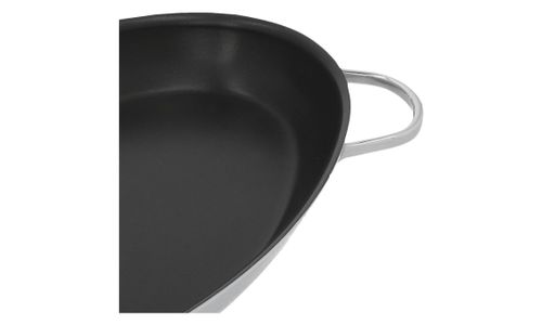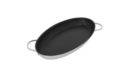 Versgebakken vis met een zalig sausje en wat lekkere groentjes erbij, dat is puur genieten. Onze ruime, ovale vispan (45 x 24 cm) past op twee kookzones tegelijk. Zo bak je met gemak een paar flinke zeetongen, een volledige roggevleugel of een dozijn coquilles. Het solide 5-lagenmateriaal tot aan de rand geleidt de warmte vlot. Dankzij de professionele en duurzame Duraslide® antikleeflaag krijg je met weinig vetstof een optimaal resultaat. De pan heeft een lage gebogen rand, waardoor je de vis er makkelijk uitschept of zo op een serveerschotel laat glijden. Gebruik enkel accessoires van silicone of hout om krassen te voorkomen. Dit degelijke model is geschikt voor eender welke warmtebron, ook inductie. De stevige, gelaste grepen liggen goed in de hand, waardoor je je rijkelijk gevulde pan toch makkelijk optilt. De slim geplaatste zijdelingse grepen maken het in en uit de oven nemen ook heel gemakkelijk. Afwassen is zo gebeurd. Hiermee bereid je jaar na jaar met veel voldoening het beste uit de zee.