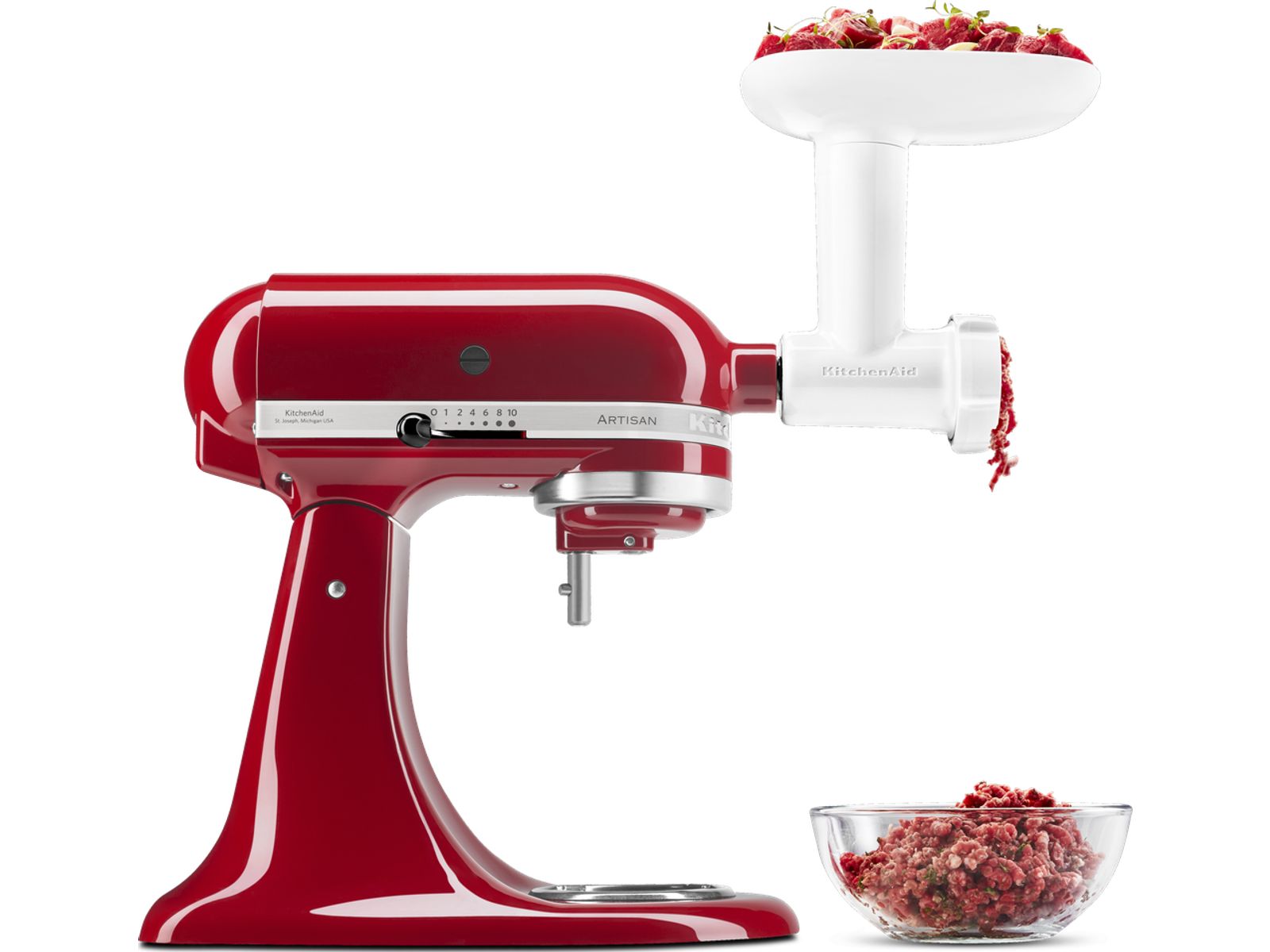 De populaire KitchenAid voedselmolen voor al onze mixers/keukenrobots is nu krachtiger en gebruiksvriendelijker dan ooit. Je kunt hiermee snel allerlei verschillende soorten ingrediënten fijnhakken, raspen en malen. Maak thuis voedzame en smakelijke gerechten zoals gehaktbrood, falafel, salsa en burgers met de KitchenAid voedselmolen. Je kunt de grove (6 mm) of de fijne (4,5 mm) roestvrijstalen maalschijven gebruiken om al je ingrediënten te malen en te hakken. De voedselmolen is niet alleen ideaal om vlees te malen, maar ook om droog brood te verkruimelen en groente, fruit, noten en kaas te raspen. De voedselmolen van KitchenAid wordt geleverd met een verwijderbaar blad en een handige stamper om ingrediënten veilig naar de maalschijven te duwen. Het accessoire is vaatwasmachinebestendig en dus eenvoudig schoon te maken. Laat je creativiteit de vrije loop en gebruik deze voedselmolen samen met de fruit- en groentezeef of het worstvulapparaat van KitchenAid om worstjes, sauzen en jam te maken.