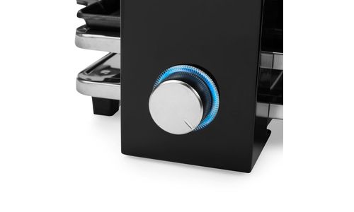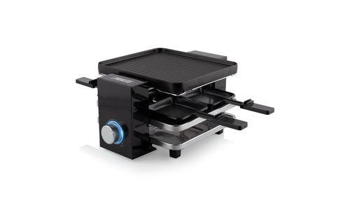 Nooit meer kiezen tussen grillen of gourmetten, je legt eenvoudig de vlakke of geribbelde zijde van de grillplaat bovenop. De grillplaat is gemaakt van hoogwaardig, dubbelzijdig, niet vervormbaar aluminium en voorzien van een sterke antiaanbaklaag. Hierdoor heb je geen olie of boter nodig en kan je op een gezonde manier toch genieten van een feestelijk en gezellig etentje. De zwarte raclette is een echte eyecatcher op tafel. Stel de juiste temperatuur in middels de verlichte thermostaat, die er ook nog eens stijlvol uit ziet.