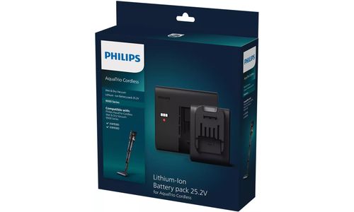 Lithium-ionbatterij van 25,2 V, compatibel met de Philips AquaTrio snoerloze Wet & Dry-stofzuiger uit de 9000-serie. Verdubbel de looptijd met deze extra batterij.