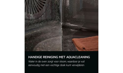 Maak je oven op een natuurlijke en gemakkelijke manier schoon met AquaCleaning. Door het toevoegen van water in de oven ontstaat er stoom die hardnekkige resten op het oppervlak losmaakt, zodat je ze gemakkelijk kunt verwijderen met een vochtige doek.