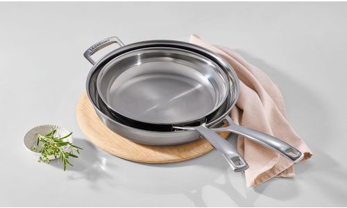 3-Ply techniek: hoogwaardig rvs en aluminium zijn met elkaar verbonden tot een drielaags materiaal dat de warmte gelijkmatig en zacht over de hele pan verspreidt. Het materiaal kenmerkt zich door een snelle, gelijkmatige warmteverdeling en is bijzonder geschikt voor de dagelijkse keuken.