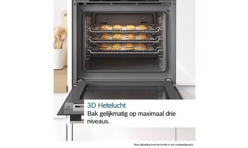 Nu kun je tal van lekkernijen, zoals koekjes, op maximaal drie niveaus tegelijk bakken. De ventilator van 3D warme lucht verdeelt de warmte snel en gelijkmatig door de ovenruimte. Je kunt ook drie gerechten tegelijk bereiden in één oven. Zo bak je lasagne voor de lunch, gebraad voor het diner en muffins voor het dessert allemaal samen, zonder dat de smaken zich mengen.